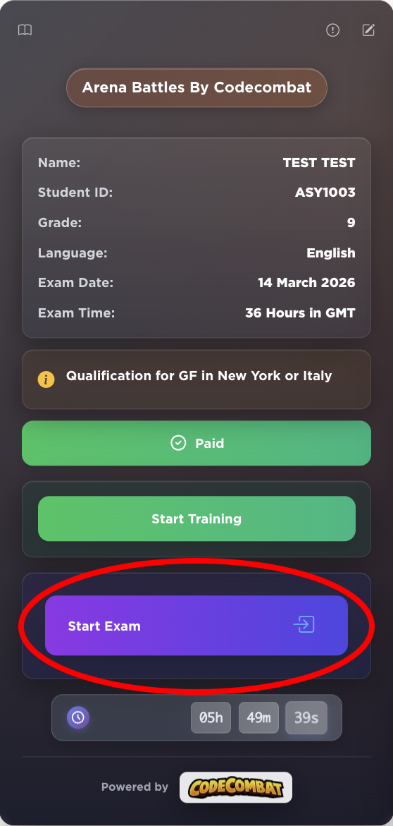 Log in to your Coding Olympiad student panel. Click the START EXAM button on your exam card. Do not click the START EXAM button before reading all the instructions and making sure you are ready.